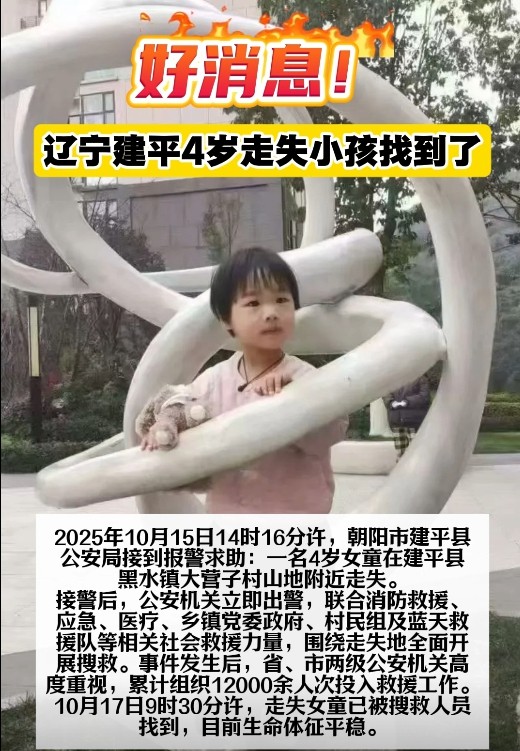 2025年10月15日14時(shí),當(dāng)“4歲女童走失”的警情從遼寧建平傳出,一場(chǎng)跨越地域與身份的愛(ài)心接力就此啟程,最終以“生命體征平穩(wěn)”的消息畫(huà)上圓滿(mǎn)句點(diǎn)。這不僅是一次搜救的成功,更是一幅“一方有難八方支援”的生動(dòng)畫(huà)卷。